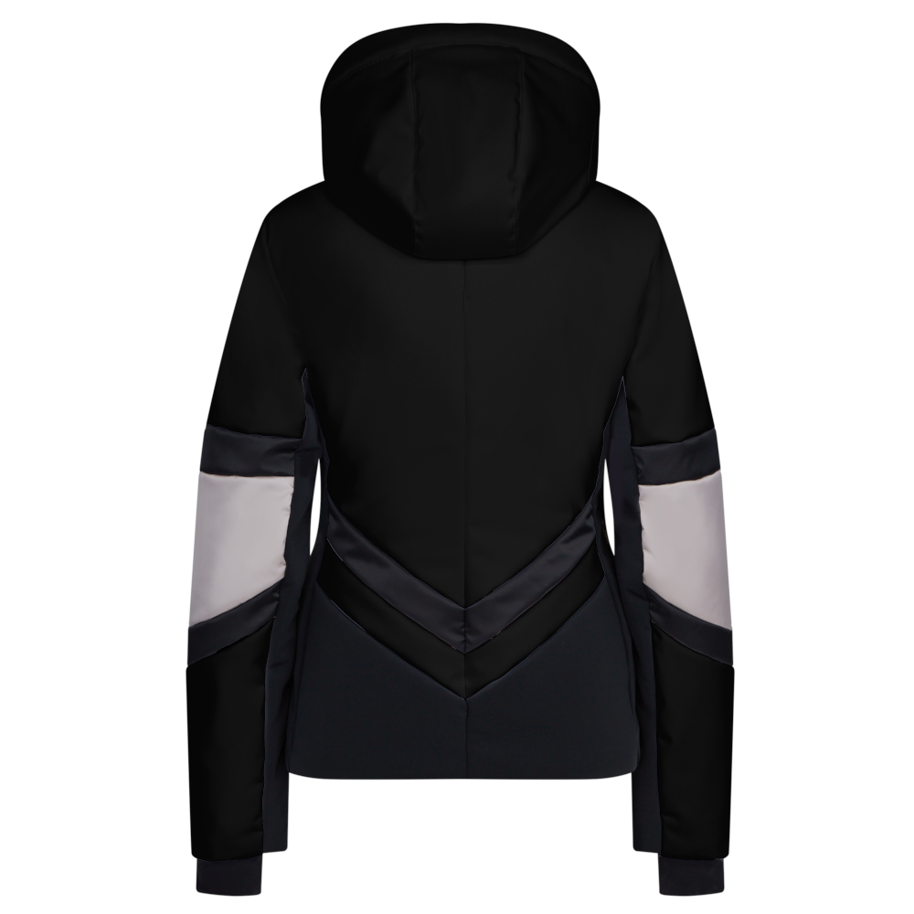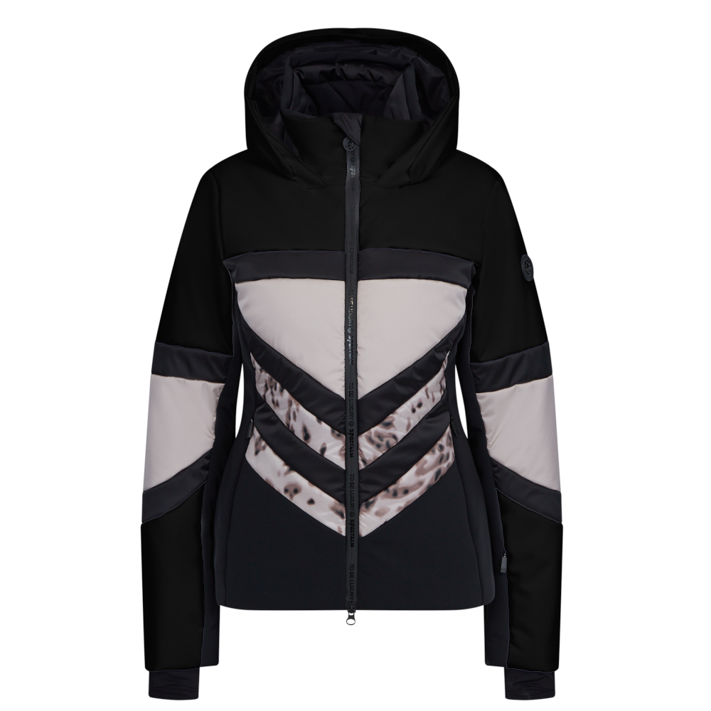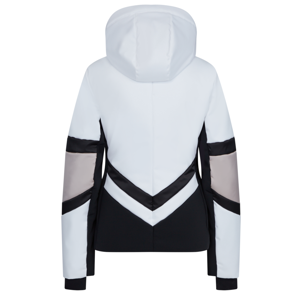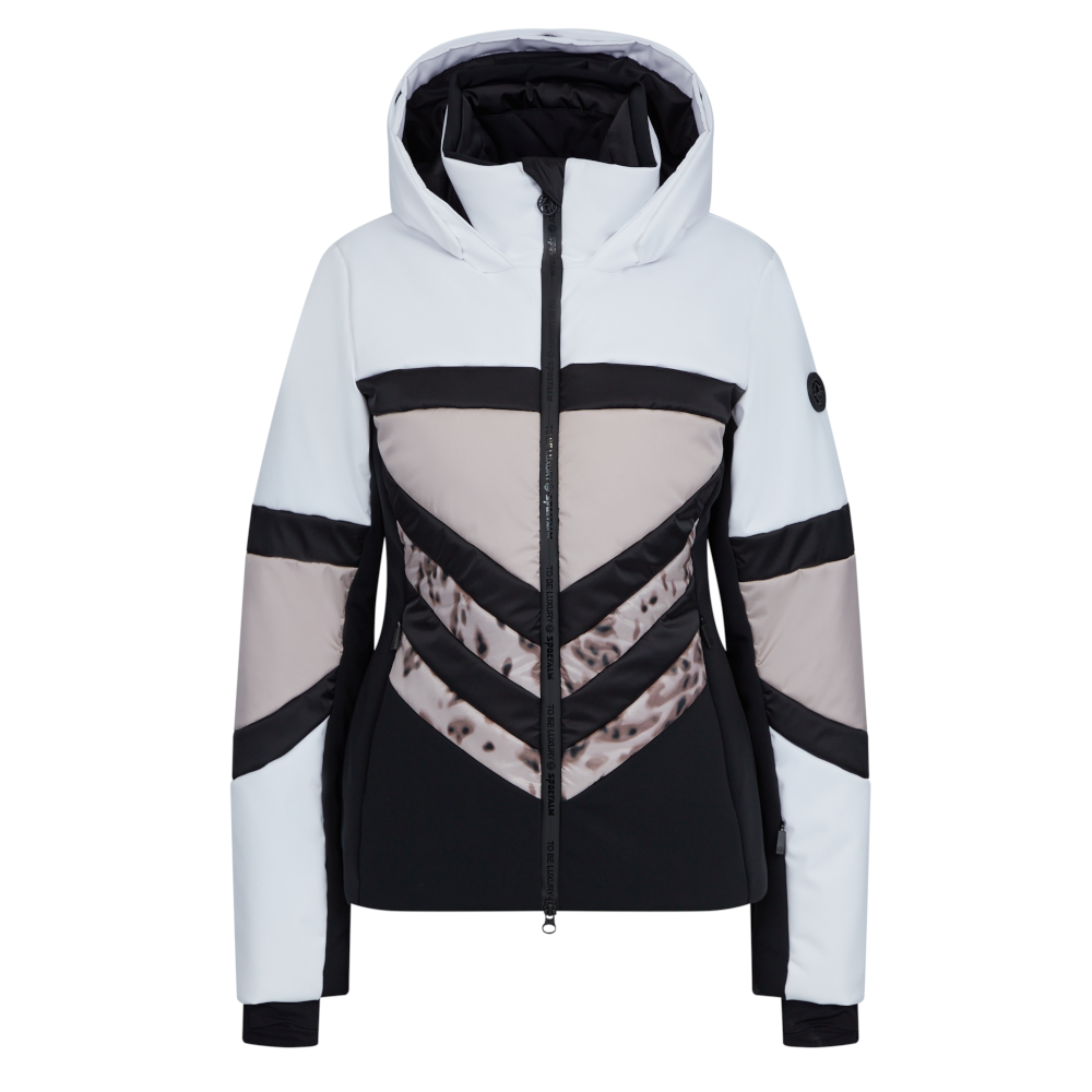 Pruhované vsádzky vo svetlých a tmavých kontrastoch urobia z bundy urobia pútavý kúsok. V deliacom šve vpredu sú zakomponované dve vrecká na zips kryté švom. Šírka odopínacej kapucne je nastaviteľná pomocou šnúrky a má zabudované vrecko na slnečné okuliare. Rukávy majú mäkké manžety s otvormi na palce a pri leme vľavo je našité malé vrecko na zips prekryté švom. Na ľavom ramene je umiestnený kvalitný nit Sportalm. Viditeľne všitý vode odolný zips s matne lesklým nápisom Sportalm slúži ako zapínanie v strede prednej časti. Na vnútornej lége je umiestnená transferová potlač nápisov Sportalm. Bunda je celá podšitá a má snežný pas s logom zdobeným elastickým pásom. Podšívka má náplasťové vrecko a vrecko na zips kryté švom. Na pravom hornom ramene je zakomponovaný systém RECCO. Dĺžka chrbta: pri veľkosti 36 je 63,5 cm