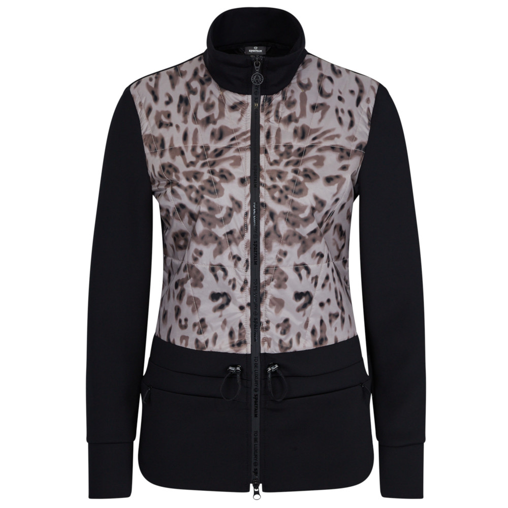 Kvalitný elastický materiál dodáva bunde vysoký komfort nosenia. Polstrovaná predná časť z kvalitnej nylonovej tkaniny s trendovým leopardím dizajnom dodáva bunde moderný vzhľad. Vrchné prešívanie na nylonovej tkanine dodáva športový nádych. V páse je sťahovacia šnúrka, ktorá umožňuje individuálne nastavenie šírky. Vpredu sú v krížovom šve zapracované vrecká na zips prekryté švami na dôležité drobnosti. Stred chrbta zdobí módna páska. Viditeľný všitý vodeodolný zips s matne lesklým nápisom Sportalm slúži ako zapínanie v strede prednej časti. Bunda je čiastočne podšitá. Dĺžka chrbta: pri veľkosťi 36 je 63,8 cm