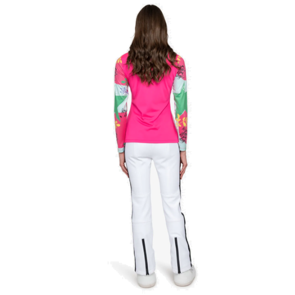 Spodná bielizeň z česaného džerseja má farebný vzor tlače na prednej strane a na rukávoch. Prednú časť zdobí aj motív silikónových bodiek, ktorý dodáva hravý akcent. Jednoduchý stojatý golier a chrbát zaisťujú vyvážený vzhľad. Krátky zips v strede prednej časti uľahčuje obliekanie. Nápis Sportalm na golieri dodáva spodnej bielizni výrazný a športový nádych. Dokonalý odev, ktorý kombinuje štýl a funkčnosť.