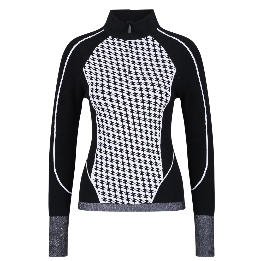 – Hlavné prvky: Priedušná, pot odpudzujúca a hrejivá priadza; kopíruje postavu s úzkymi intarzívnymi pruhmi vpredu a vzadu; rebrované manžety na lemovaní